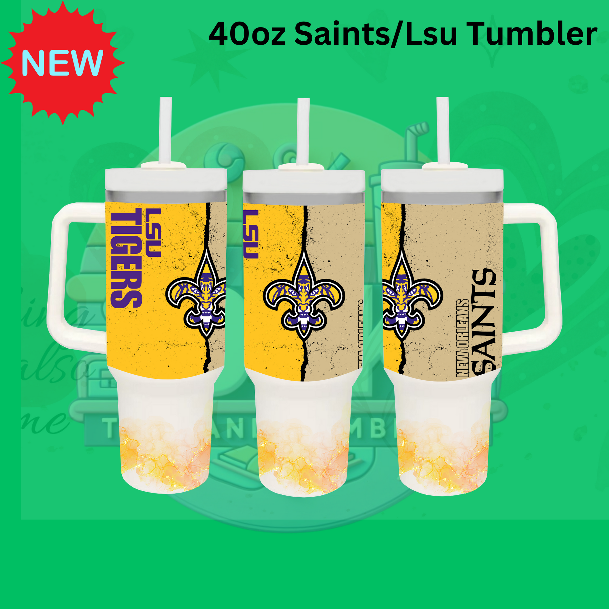 Show off your team pride with the 40oz Dual Team Tumbler - LSU Tigers & New Orleans Saints Edition! Perfect for die-hard fans of both teams, this sleek and durable tumbler features bold designs representing the purple and gold of LSU and the black and gold of the Saints.