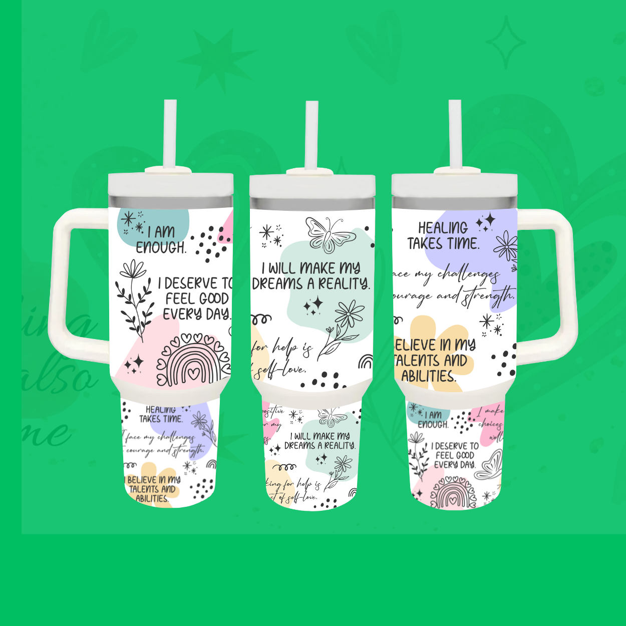 Introducing the 40oz Inspirational Tumbler with Handle – your perfect companion for staying hydrated on the go! Crafted with premium stainless steel, this tumbler keeps your drinks ice-cold for over 12 hours, ensuring refreshing sips throughout your day. The easy-grip handle offers convenience for carrying, while the double-wall vacuum insulation maintains your beverage temperature without condensation. Its sleek design is adorned with motivational quotes to uplift and inspire you, whether you're at the gym, office, or out on an adventure. Durable, stylish, and functional, this tumbler is a must-have for anyone seeking both inspiration and hydration.